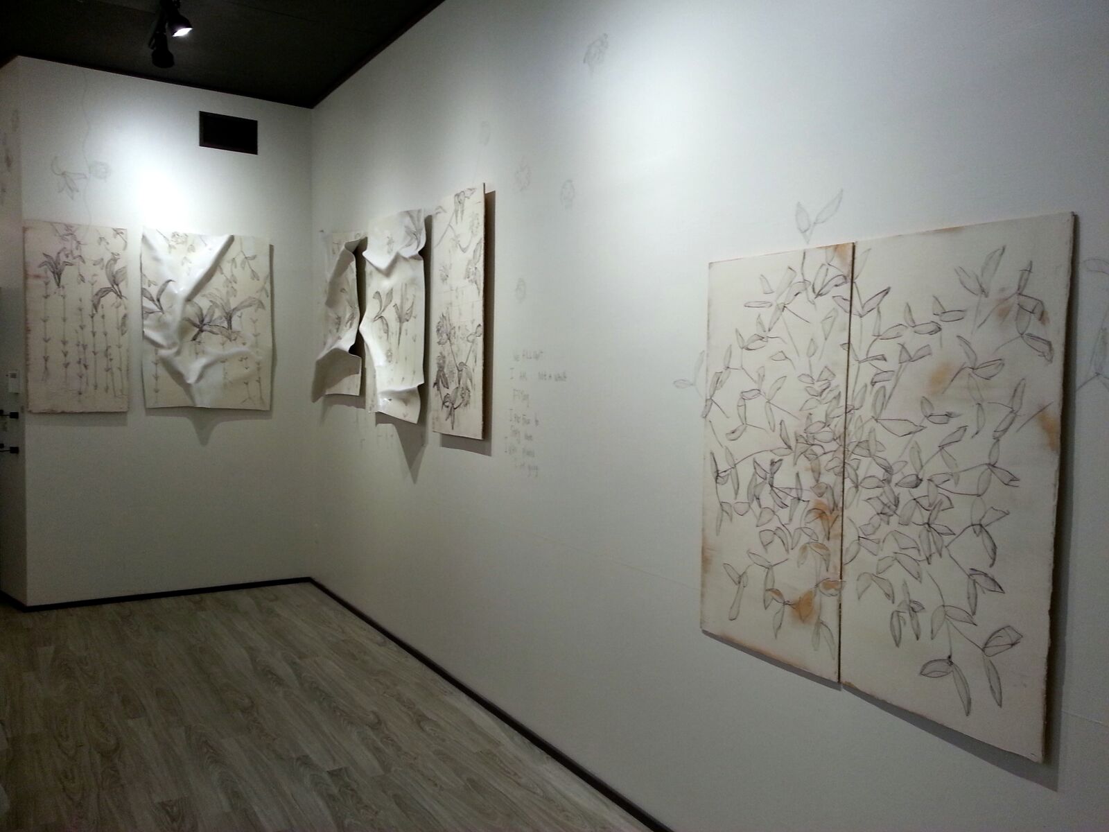Guest House Installation, includes an extension of cedar forest stand. Drawings from Welcome to the Garden Party, II wall drawing encompass the not shown wall.